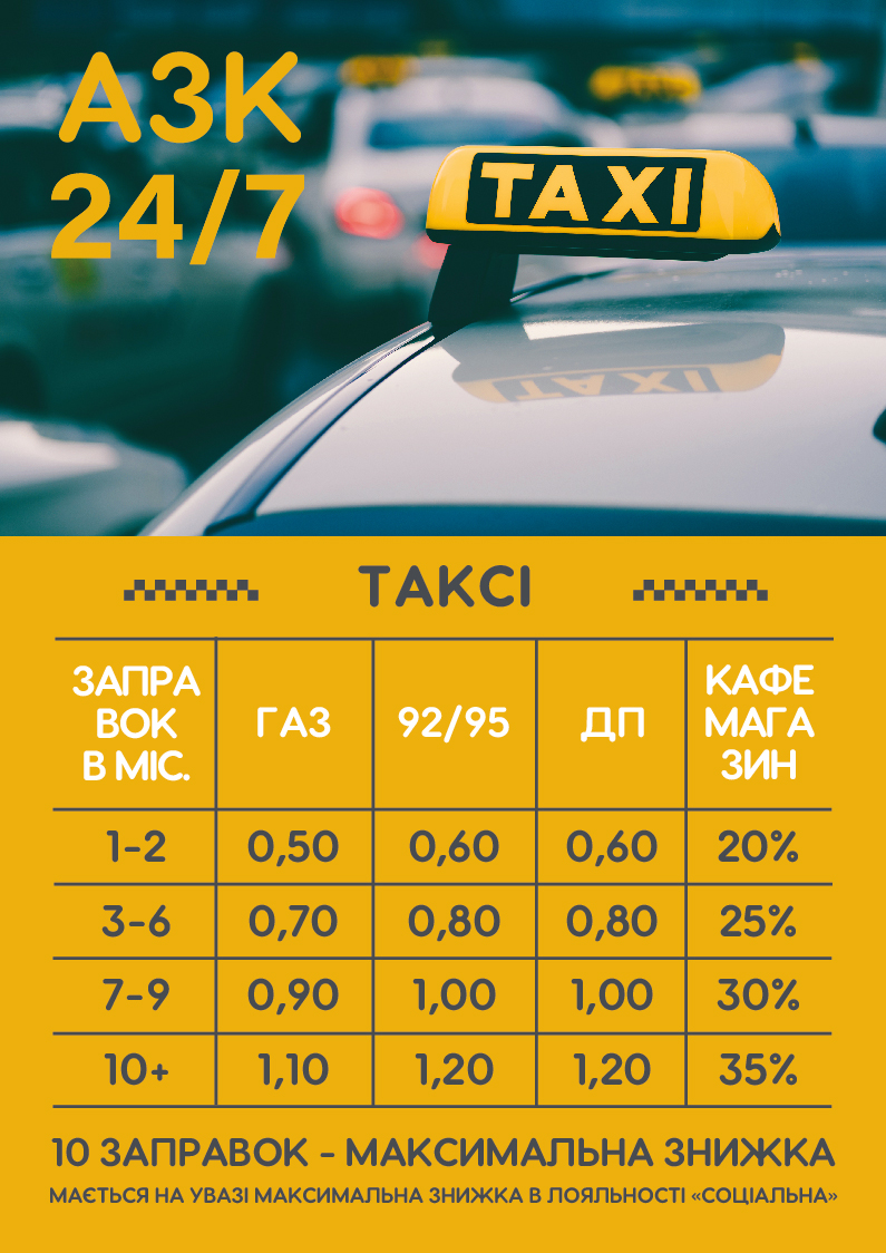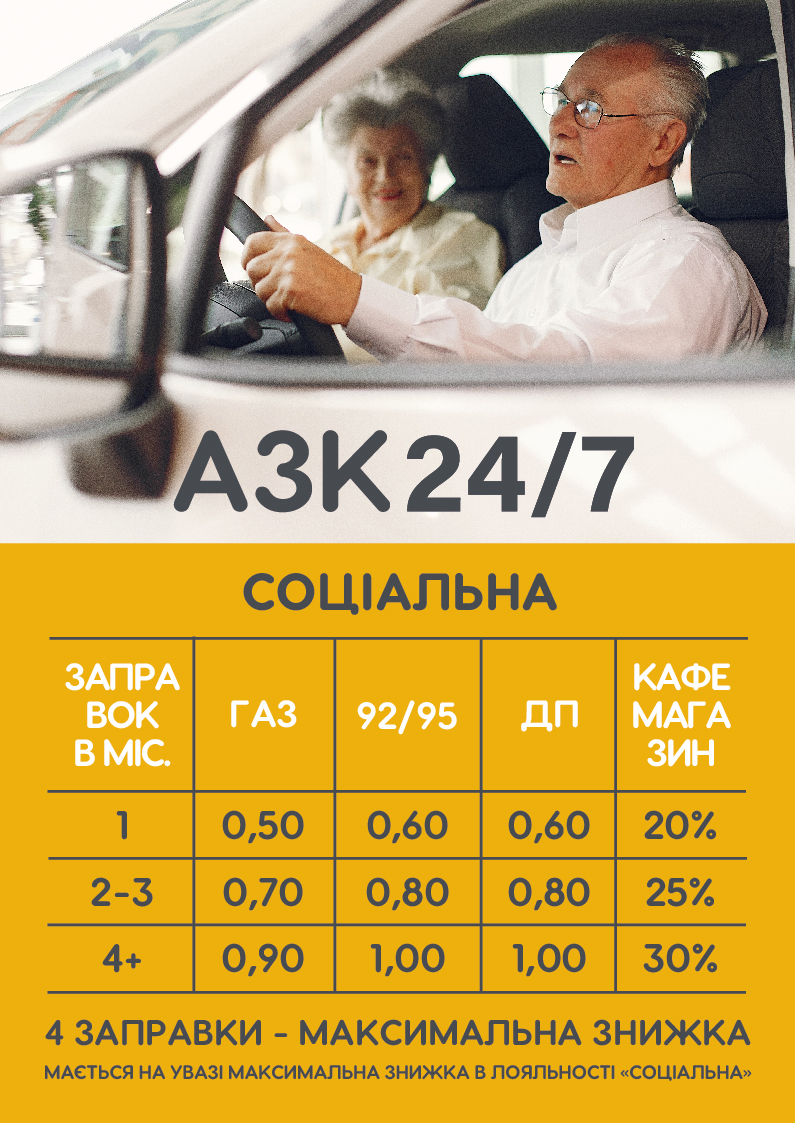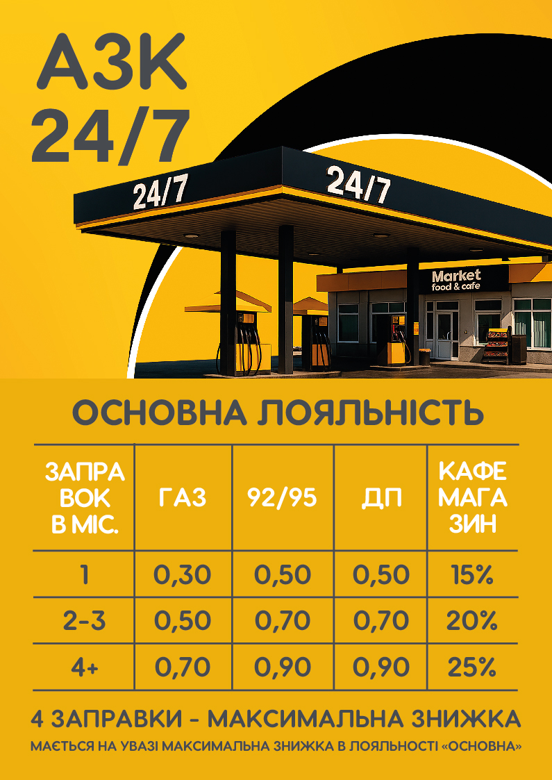• 1 заправка — знижка: газ 0,30 грн/л, бензин А-95 і ДП 0,50 грн/л, товари магазину 15%.